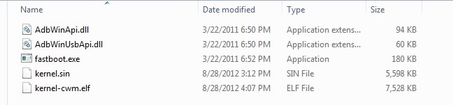 1. Extract fastboot_with_Android_USB_file.rar to C:\ drive. This should contain two folders named fastboot and usb_driver.2. Extract AcroS_Kernel_61A245.zip to the fastboot folder. Your fastboot folder should now contain the following files.